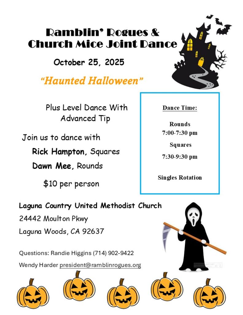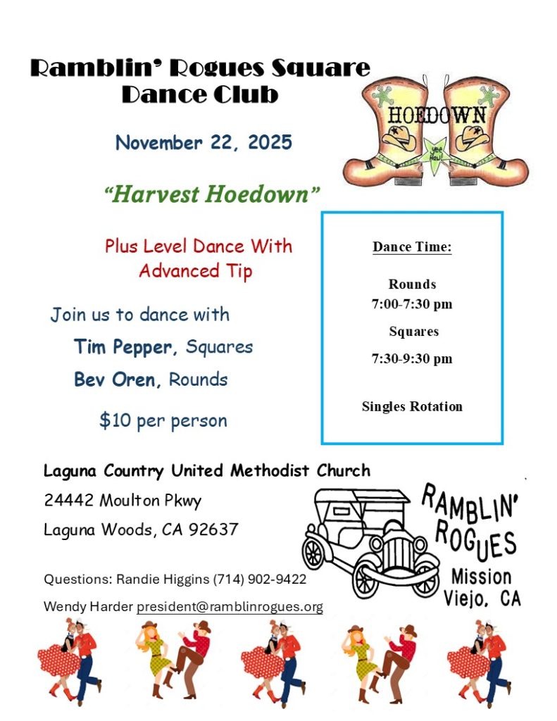 The Ramblin' Rogues Square Dance Club Join Us for a Taste of Square Dancing CLASS DESCRIPTION https://www.cityofmissionviejo.org/sites/default/files/murray-memo-august-2025.pdf 2nd SESSION REGISTRATION For Angels: https://missionviejo.perfectmind.com/22969/Reports/BookMe4LandingPages/CoursesLandingPage?widgetId=c3a6893b-76f5-4d6b-b413-c0cd896b9486&redirectedFromEmbededMode=True&courseId=25a3b212-225f-43db-8cdb-773c98e89d03 For New Dancers: https://missionviejo.perfectmind.com/22969/Reports/BookMe4LandingPages/CoursesLandingPage?widgetId=c3a6893b-76f5-4d6b-b413-c0cd896b9486&redirectedFromEmbededMode=True&courseId=9d516523-cb5c-4ca0-bd12-ed0ffa2e09a5 Club Dance Check out our Facebook page