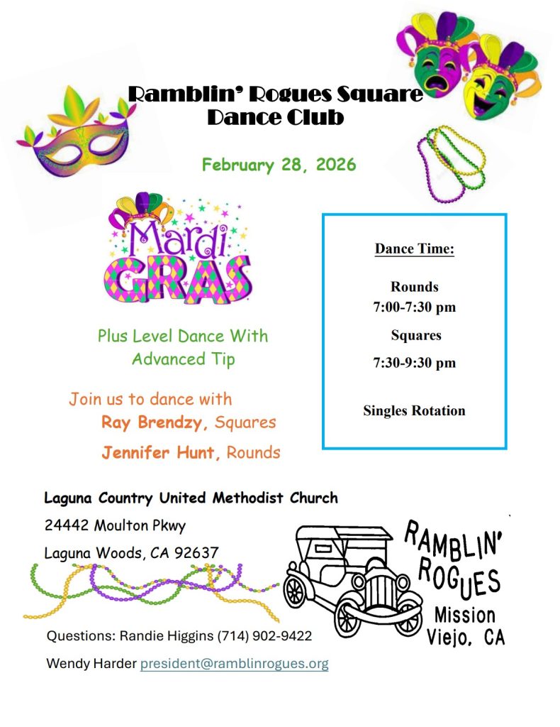 The Ramblin' Rogues Square Dance Club Join Us for a Taste of Square Dancing CLASS DESCRIPTION https://www.cityofmissionviejo.org/sites/default/files/murray-memo-august-2025.pdf 3rd SESSION REGISTRATION For Angels: https://missionviejo.perfectmind.com/Contacts/BookMe4LandingPages/CoursesLandingPage?widgetId=15f6af07-39c5-473e-b053-96653f77a406&redirectedFromEmbededMode=False&courseId=255438a1-4a7a-4137-a112-f72caeb4890f For Class Members: https://missionviejo.perfectmind.com/Contacts/BookMe4LandingPages/CoursesLandingPage?widgetId=15f6af07-39c5-473e-b053-96653f77a406&redirectedFromEmbededMode=False&courseId=dd4295e7-aad7-4f70-8f84-e0cab04b4c98 For Angels For Class Members Club Dance Check out our Facebook page