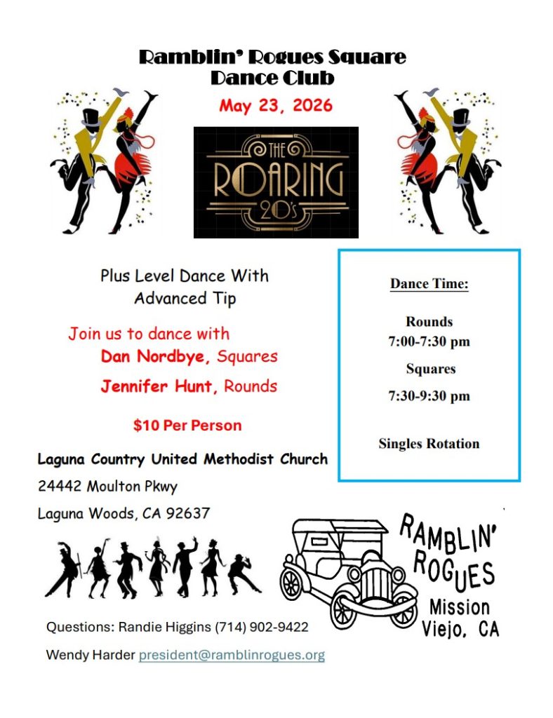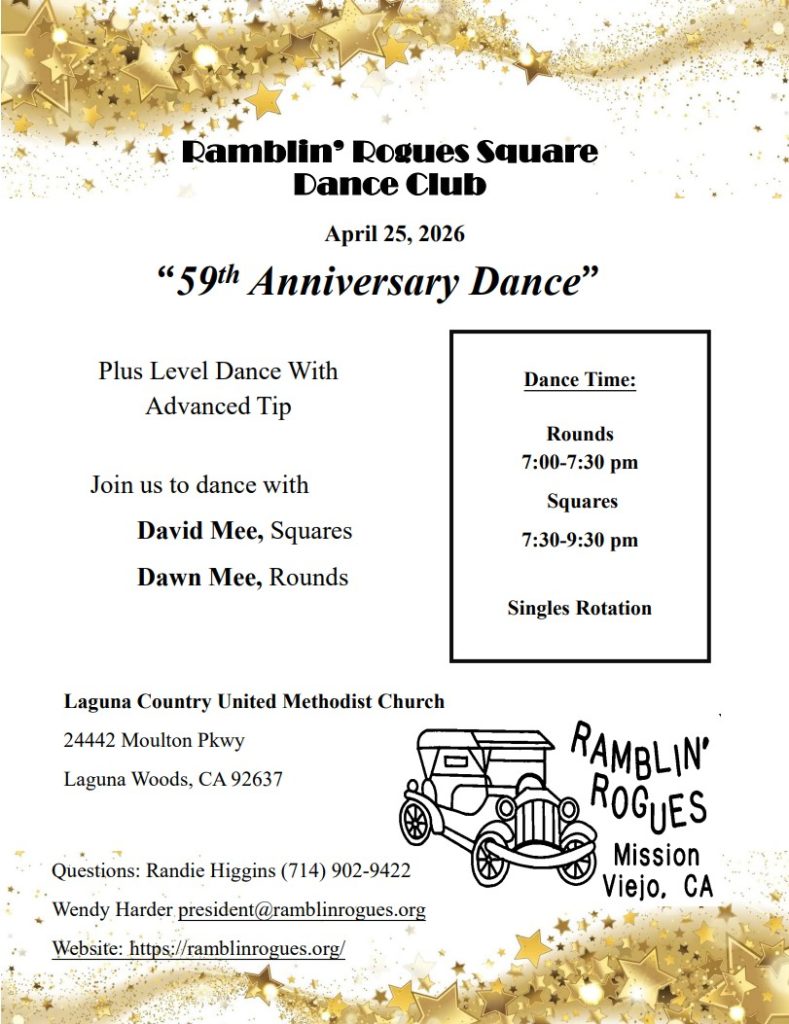 The Ramblin' Rogues Square Dance Club Join Us for a Taste of Square Dancing CLASS DESCRIPTION https://www.cityofmissionviejo.org/sites/default/files/murray-memo-august-2025.pdf 4th SESSION REGISTRATION For Angels: https://missionviejo.perfectmind.com/22969/Reports/BookMe4LandingPages/CoursesLandingPage?widgetId=c3a6893b-76f5-4d6b-b413-c0cd896b9486&redirectedFromEmbededMode=False&courseId=b5f66cfa-e4dd-4982-ab81-472fb661c2a4 For Class Members: https://missionviejo.perfectmind.com/22969/Reports/BookMe4LandingPages/CoursesLandingPage?widgetId=c3a6893b-76f5-4d6b-b413-c0cd896b9486&redirectedFromEmbededMode=True&courseId=4ea3a094-c4ea-4086-9361-1e69a32db123 For Angels For Class Members Club Dance Check out our Facebook page