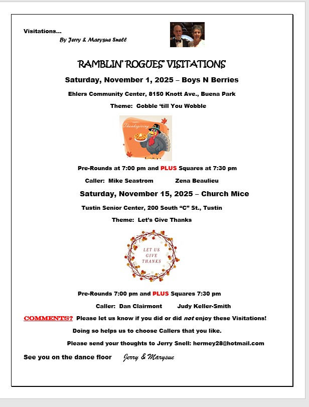 The Ramblin' Rogues Square Dance Club Dances & Events CLUB DANCE When: Saturday October 25, 2025Where: Laguna Country United Methodist Church 24442 Moulton Pkwy, Laguna Woods, CA 92637Caller: Rick HamptonCuer: Dawn MeeRounds: 7:00Plus Squares: 7:30Advanced Tip https://buddyweaver.com/bakersfield/