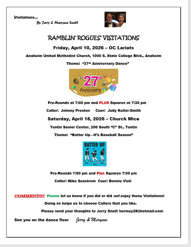 The Ramblin' Rogues Square Dance Club Dances & Events CLUB DANCE When: Saturday April 25, 2026Where: Laguna Country United Methodist Church 24442 Moulton Pkwy, Laguna Woods, CA 92637Caller: David MeeCuer: Dawn MeeRounds: 7:00Plus Squares: 7:30Advanced Tip